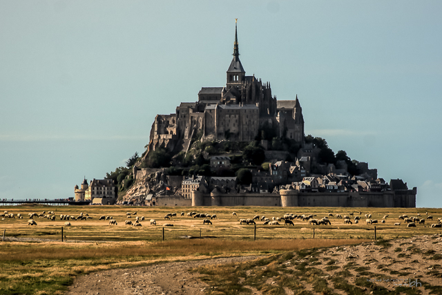 Sind mittags in diese Richtung gewandert bis zu einer großen Schafsweide, von der wir nicht wussten, ob wir mit Sid durch die Herde gehen durften. Haben es lieber mal sein gelassen und sind umgekehrt. Auf Le Mont-Saint-Michel sind wir aber schon mal gewesen, und aufgrund von Forenberichten, dass Hund am Eingang in Käfige abgegeben werden müssen, wollten wir auch gar nicht mehr weiter.